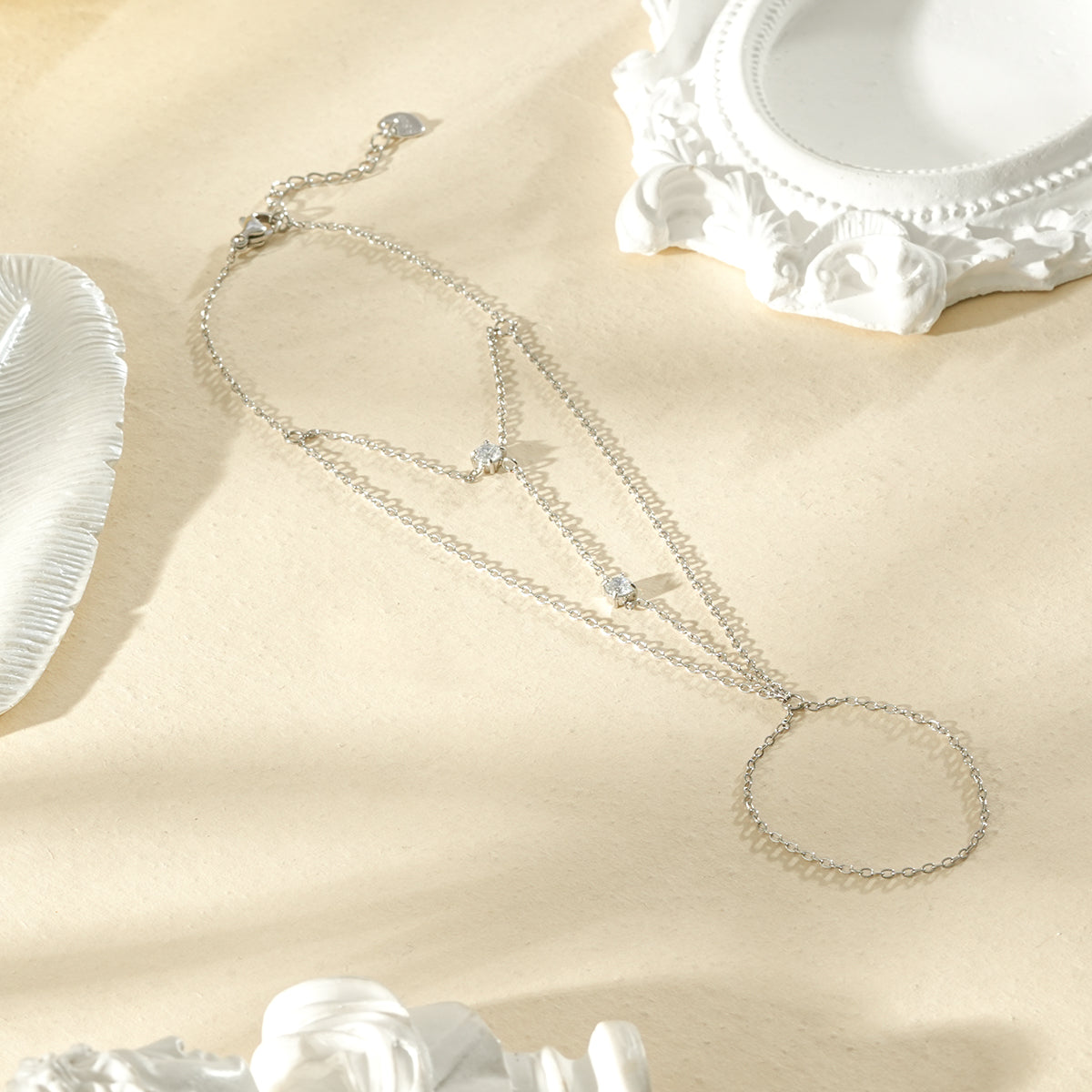 La chaîne de main Kaia se distingue par ses lignes fines et son trio de strass délicats. Un bijou discret...
