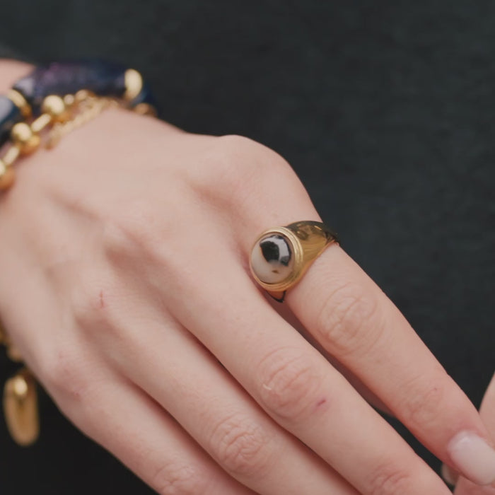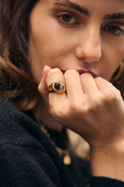 La bague Isola séduit par sa silhouette organique et son cabochon en résine marbrée aux nuances naturelles.Sa monture dorée au...