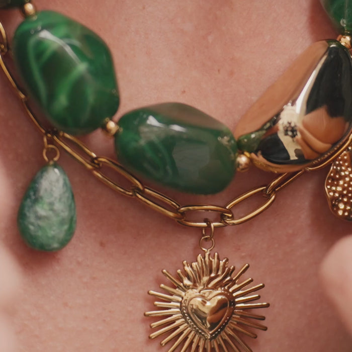 Le collier Amalia se distingue par sa chaîne dorée à maillons et ses pendentifs symboliques mêlant cœur rayonnant, pierre verte...
