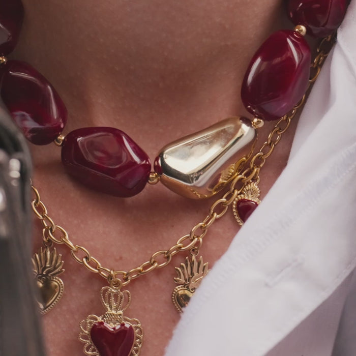 Le collier Rosa mêle douceur et caractère avec ses pendentifs en forme de cœur dorés et émaillés d’un rouge profond....
